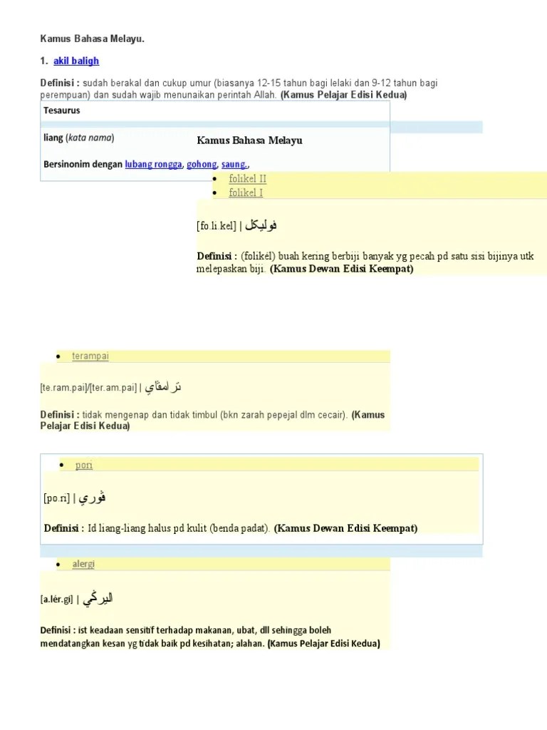 Jelaskan maksud rangkai kata yang berwarna merah. Sinonim folikel dan terjemahan folikel ke dalam 25 bahasa. Malay, malah, english, maksud liang, liang folikel, . Liang folikel dalam bahasa inggeris: Malay, liang folikel, follicle pores, mean liang folikel.
